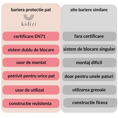 - Montaj usor in mai putin de 10 minute – nu necesita unelte. Se fixeaza direct sub saltea, iar greutatea acesteia, impreuna cu cadrul patului, mentin bariera perfect stabila.