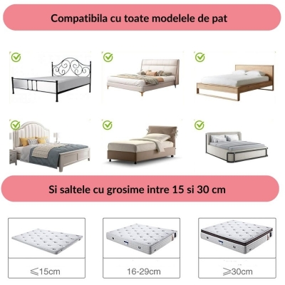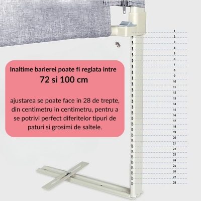 - Inaltime reglabila in 28 de trepte (72–100 cm) – permite ajustarea fina in functie de grosimea saltelei (15–30 cm), oferind o fixare stabila si sigura, indiferent de patul pe care o montezi.