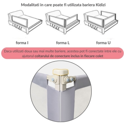 - Model interconectabil – daca doresti sa protejezi mai multe laturi ale patului, barierele pot fi conectate intre ele cu ajutorul coltarului de imbinare inclus. Astfel, se creeaza o zona continua de siguranta, stabila si bine fixata.