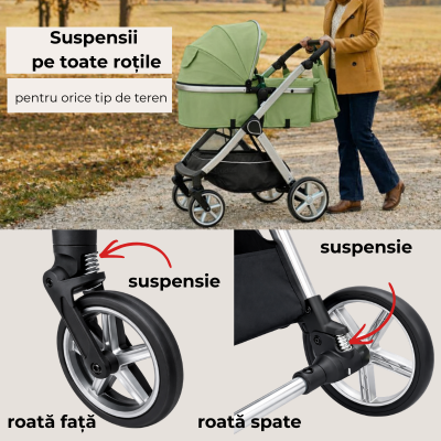 Caruciorul 3 in 1 Kidizi Moveo verde este un sistem complet pentru bebelusi, conceput pentru parinti care isi doresc un produs versatil, usor de utilizat si adaptabil fiecarei etape de crestere. Include landou pentru nou-nascuti, parte sport si scoica auto compatibila, oferind o solutie completa de la nastere pana la aproximativ 4 ani.