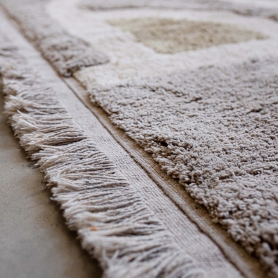 Covorul din bumbac are un design modern si poate fi spalat intr-o masina de spalat obisnuita de acasa. Acest model de covor este perfect pentru camera copiilor, camera de zi sau dormitoru. Este sigur deoarece se folosesc coloranti naturali pe materialului moale si flexibil.