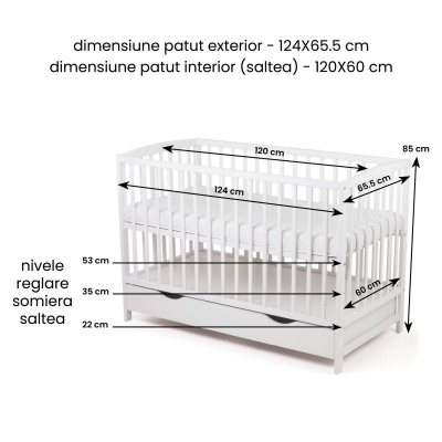 - Dimensiuni optimizate. Interiorul de 120x60 cm si exteriorul de aproximativ 125x65 cm fac patutul potrivit pentru camere de orice dimensiune, pastrand functionalitatea fara a ocupa spatiu excesiv.