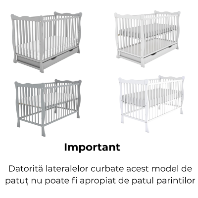 Modelul Isla cu sertar si roti are un design clasic, elegant, cu laterale usor curbate. Tocmai din acest motiv, patutul nu este conceput pentru a fi apropiat sau atasat de patul parintilor si nu este compatibil cu utilizarea tip cosleeper.