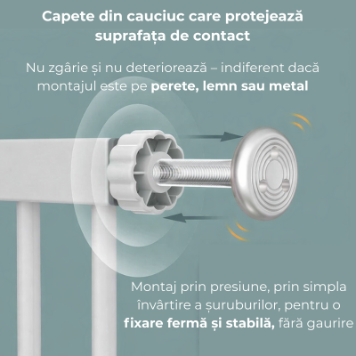 Poarta de siguranta copii Kidizi Rexa se monteaza rapid, prin simpla rotire a suruburilor laterale, fara a fi necesara gaurirea peretilor sau a tocurilor de usa. Capetele din cauciuc moale protejeaza suprafetele de contact si permit o fixare stabila pe perete, lemn sau metal, fara zgarieturi sau urme vizibile.