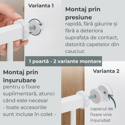Poarta de siguranta copii Kidizi Rexa vine cu kit complet de montaj, care permite atat fixarea prin presiune, cat si fixare suplimentara prin insurubare, pentru situatiile in care este necesar un plus de stabilitate. In pachet sunt incluse toate accesoriile necesare, iar instructiunile sunt clare, simple si in limba romana, astfel incat montajul sa poata fi realizat fara dificultati.