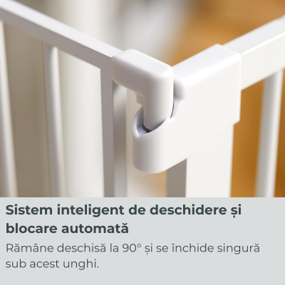 Poarta de siguranta Kidizi Rexa se deschide in ambele sensuri, adaptandu-se usor fluxului de trecere din locuinta. Atunci cand este deschisa sub 90°, poarta se inchide automat, reducand riscul de a ramane deschisa accidental. Daca este deschisa peste 90°, ramane deschisa, pentru un acces comod.
