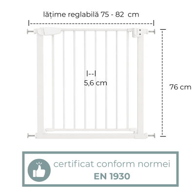 Poarta de siguranta copii Kidizi Rexa are latime reglabila intre 75 si 82 cm si o inaltime de 76 cm, fiind potrivita pentru delimitarea accesului in usi, holuri sau in partea superioara sau inferioara a scarilor. Structura este conceputa astfel incat sa ofere stabilitate si siguranta, fara a afecta finisajele existente. Este certificata conform standardului european EN 1930,