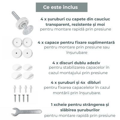 - Continut pachet – 4 suruburi cu capete din cauciuc pentru montaj prin presiune, 4 capace pentru fixare suplimentara, 4 discuri dublu adezive, 4 suruburi si 4 dibluri pentru montaj prin insurubare, 1 cheie pentru reglaj