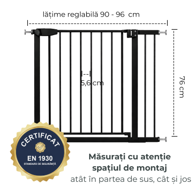 Despre Poarta de siguranta copii Kidizi Rexa negru, reglabila 90-96 cm, montaj prin presiune, inchidere automata, certificata EN1930