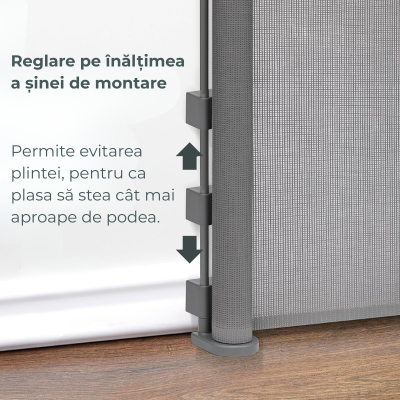 Un element care diferențiază Kidizi Flexa de multe porți textile este sistemul de montare reglabil pe verticală. Acesta permite instalarea chiar și atunci când există plintă, prag sau diferență de nivel la podea, fără improvizații și fără compromisuri la siguranță.
