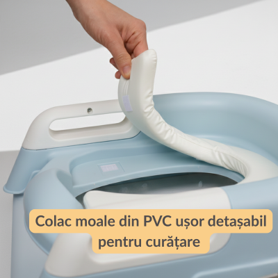 Colacul detasabil din PVC moale elimina senzatia de rece si ofera copilului un confort real atunci cand sta asezat. Datorita sistemului de prindere cu scai, colacul se scoate rapid si se curate usor, asigurand o igiena excelenta in fiecare zi. In plus, structura stabila si scarita cu trepte late ii permit copilului sa urce singur, formand obiceiuri de autonomie inca de la primele utilizari.