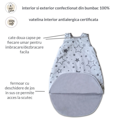 Poate fi utilizat de la 0-6 luni, oferind copilului un somn linistit si confortabil. Recomandat pentru temperaturi de 20-23 grade, grosime 1 tog.