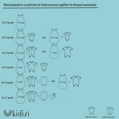 Saculetul de dormit Kidizi are o grosime medie de 1 tog si este captusit la interior cu vatelina moale antialergica care ii va tine cald celui mic, atata timp cat temperatura din camera este intre 20 si 23 grade.