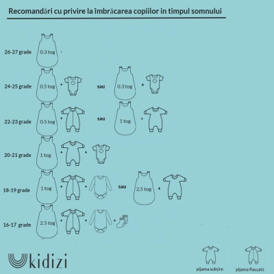 - Grosime 0.5 tog - recomandat pentru temperaturi de 22-25 grade( a se consulta tabelul cu recomandari cu privire la imbracamintea copilului pe langa sac);