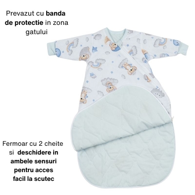 Este confectionat din bumbac 100% certificat Oeko-Tex, interior cu vatelina antialergica si fermoar lateral cu 2 cheite (deschidere in 2 sensuri) pentru schimbari rapide ale scutecului. Croiul lejer, deschiderea tip „carte” si manecile cu mansete ajustabile ajuta la o asezare corecta si confort termic stabil.