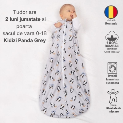 Despre Sac dormit copii de vara 0-18 luni Kidizi Panda Grey, 100% bumbac, 80 cm, 0.5 tog