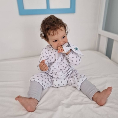 Despre Salopeta pijama bebe cu fermoar si botosei manseta Kidizi White Grey Stars