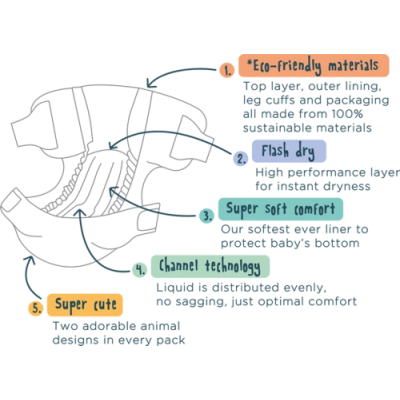 * NOU * Modelele colectiei noastre noi de scutece au inserat un strat suplimentar uscat ce absoarbe instantaneu si blocheaza umezeala, mentinand fundul bebelusului confortabil.
