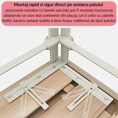 - Montaj usor in mai putin de 10 minute – nu necesita unelte. Se fixeaza direct sub saltea, iar greutatea acesteia, impreuna cu cadrul patului, mentin bariera perfect stabila.
